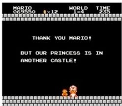 assim indo atrás dela em números regiões e castelo, onde tinham apenas, Toads que o informava com famosa fala " Thank you Mario! But our princess is in another castle" ou "Obrigado, Mario! Mas, a princesa está em outro castelo."
